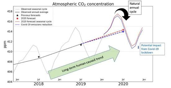基于“基林曲线”的历史记录,并结合对人为排放和气候条件的预测结果,英国气象局曾预测2020年全球CO₂浓度值将比去年增加2.80ppm(±0.57),但若把新冠疫情影响下全球CO₂排放减少8%这一因素纳入考虑,预测的浓度增加量将被修正为2.48ppm——尽管全球CO₂排放量下降使得今年CO₂浓度增值有所下降,但排放仍在继续,大气中的CO₂浓度依旧在上升。