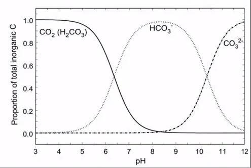 自然水体pH通常在7到9之间,在这个范围内,水体中无机碳主要以HCO3-的形式存在(图1)。对于那些只能利用CO2的沉水植物而言,这部分无机碳就是无法利用的废物。但看似“废物”的HCO3-,却被一部分植物当作香饽饽。目前已知的沉水植物中就有约50%的物种可以利用HCO3-作为碳源进行光合作用。