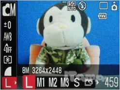 IXUS 80 IS菜单并不像它的外形,让我们有惊喜,不过这也给用户上手带来便利。在拍摄状态下,画面会显示当拍摄模式、ISO感光度、电池容量、剩余拍摄数量、光学防抖、照片尺寸等等信息。