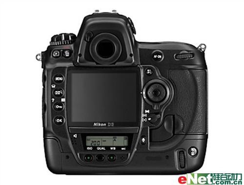 在外观方面,尼康D3几乎就是D300的放大版,不过内在可是大不相同哦。尼康D3的外观尺寸为159.5×157×87.5mm,重约1240g,沉甸甸的机身尽显专业风范。机身手柄部位为橡胶包裹,手感不错,手柄上部照例是尼康的红三角标志。D3的机顶光学取景器很是巨大,内置专用的五棱镜,在取景时视野非常明亮,机身顶部右侧设计有冷光液晶显示屏,可显示当前相机参数。在机身背部LCD右侧橡胶覆盖部位为一小盖,打开便可见双CF卡插槽,这是身为专业机型必不可少的配备。尼康D3的操控按键的分布基本延续了尼康单反系列的格局,不过在局部细节的设计更加注重人性化。