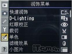 D60 的润饰菜单赋予了相机许多独特的机内编辑功能,这点上,尼康是逐渐在淡化过于专业的操控,给用户更多的空间。选择“滤镜效果”可以增强所选的颜色(红/绿/蓝),采用十字镜功能,拍摄出类似星光镜的那种效果。同时相机还内置 NEF (RAW) 处理功能。 RAW 格式影像是相机所创作的原始影像,可对影像的具体细节进行控制,如影像质量,影像尺寸和白平衡。使用新的超炫动画功能,可对一系列影像(JPEG 格式)进行定格动画操作(静止影像的连续回放)。同时还具有快速润饰选项,可增强对比度和饱和度,无需借助电脑便可改善影像质量。