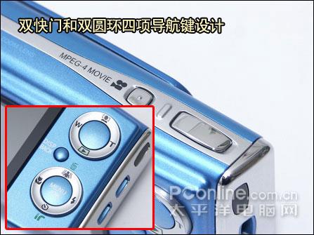 简洁、大方是Z20fd最大的标志,双快门和双圆环四项导航键的设计也具有一定突破性。它独立设计了视频拍摄快门,免去了视频和图片拍摄需要频繁切换,而且容易搞错的烦恼。而双导航键的设计,则更显可爱。它将变焦、回放和人脸识别快门这些原本独立设计的按钮集合到了上四项导航键内,使得整个机身背面看上去更简洁统一。