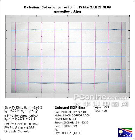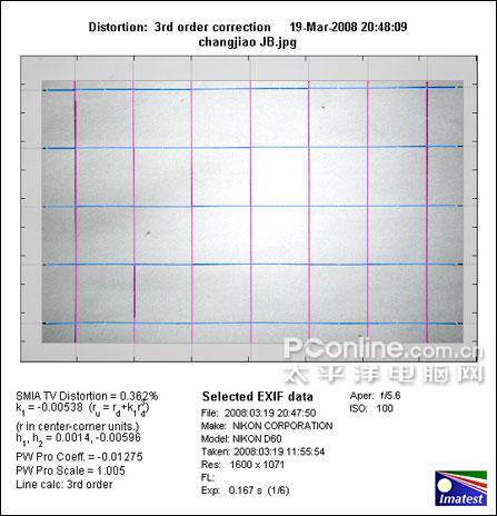 测试项目着重表现镜头所产生的图像变型,相机拍摄Imatast软件指定的正方形方格图,然后用Imatast软件进行镜头畸变的量化测试。测试结果以百分数标示,数值越接近零,表示畸变越小。数值为负的,表示为桶形畸变,画面向外膨胀。数值为正的,表示为枕形畸变,画面向内收缩。