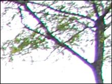 紫边控制能力可以某程度可以看得出镜头的质量。AF-S DX 18-55mm f/3.5-5.6G VR的紫边控制能力还算不错。如上图的方框100%截图,只是边缘位置的高反差区域紫边能看得出,左边的方框处于画面水平中间位置,紫边控制能力不错,只是轻微显示绿色边缘线。
