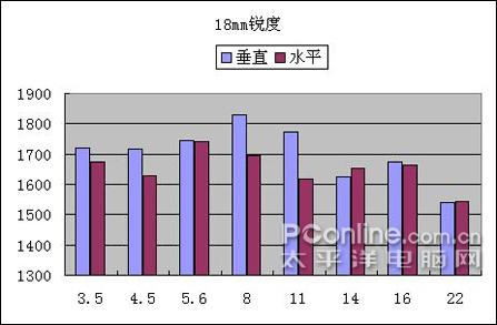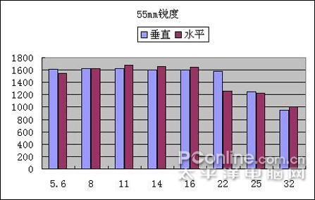 可以看的出,18MM广角端,各挡光圈的分辨率有所参差,垂直上F8的分辨率最高为1829LW/PH,实际看上去,锐度的确比较理想,也就又说明了网友所说的“F8没狗头”的说法。但水平的分辨率确下降得比较厉害,下降了100LW/PH。F3.5到F5.6相对平均些,F5.6最为理想,水平与垂直的分辨率都相当。长焦端55MM就相对稳定些,中心跟垂直都相当,但是全部分辨率最高才1600LW/PH。继续收缩光圈后由于光圈太小产生衍射影响分辨率,F32时达到最低值953LW/PH。后面的样张分析会对此作出分析。长焦端总体实际情况上看,画面的确比较模糊,分辨率相对广角端下降得明显。也许是新的镜头减少了ED镜片的原因。