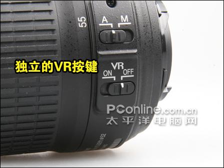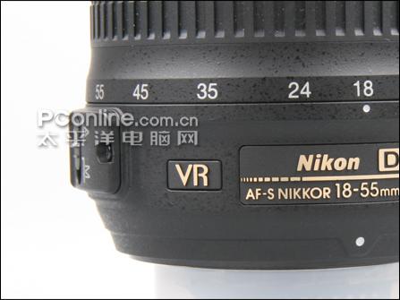 尼康AF-S DX 18-55mm f/3.5-5.6G VR镜头最值得谈论的就是其增加的防抖功能,后面的评测会详细讲到防抖的效果。VR的铭牌用金色醒目的刻在镜头上。