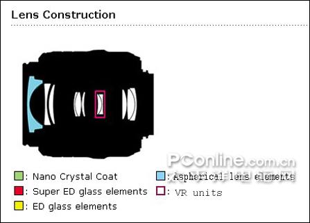 镀膜成淡紫淡黄色,镜片通透漂亮。镜头组为8 组 11 片 (1 个非球面镜片),奇怪的是上一代型号有一片ED 玻璃元件,但加了VR功能后,ED镜片没再使用。