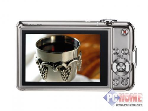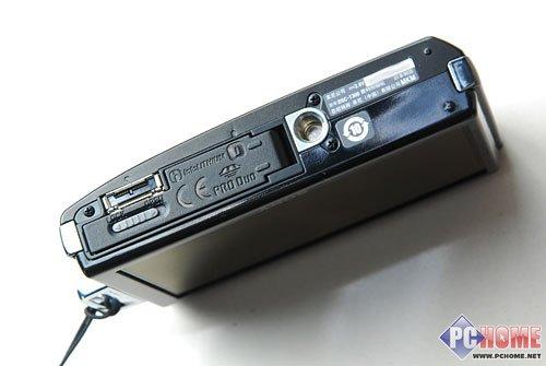 机身侧面结构简洁,除了金属条勾勒轮廓外几近无物。这款相机搭载了一块1/2.3英寸,1010万有效像素CCD感光元件,3倍光学变焦镜头,具有36~108mm的等效焦距,最大光圈为F2.8-F5.3,镜头中还使用了非球面镜片,有效提高了镜头的成像质量。