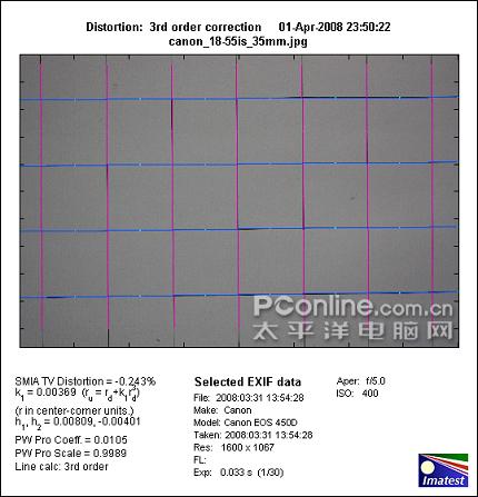 佳能EF-S 18-55mm f/3.5-5.6 IS镜头在35mm端产生-0.243%的桶形畸变