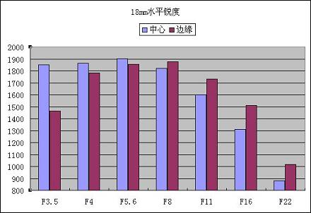 佳能EF-S 18-55mm f/3.5-5.6 IS的镜头结构相对于400D的套头EF-S 18-55mm f/3.5-5.6 II有稍微的变化,因此光学表现一定会有所不同,不禁令我们充满期待。不过直观地从上面图表来看,相对于使用1200万像素的450D来说,套头的表现较难令人满意。在18mm的最佳光圈F5.6的时候分辨率仅有1902 LW/PH。在广角端18mm时中心分辨率就已经比较接近最高数值了,不过边缘分辨率却低很多,只有1465 LW/PH。当光圈在F8往后到F22,分辨率急剧下降,在F22时,中心分辨率不足900LW/PH;而且比较令人意外的是边缘分辨率开始比中心分辨率更高,差别最大的F16时竟相差200LW/PH,这个表现较令人费解。从上表给出的数据来看,在18mm的广角端用F4是比较好的选择,分辨率和最佳光圈F5.6相差不大,而且光圈接近最大光圈,只相差1/3档,保证了充足的进光量。