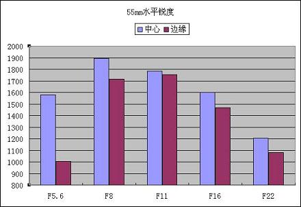 相对于18mm、35mm时最大光圈都可用的情况,佳能EF-S 18-55mm f/3.5-5.6 IS在长焦端55mm的表现略为逊色。最大光圈时分辨率明显偏低,边缘分辨率更只有1005LW/PH,这使得最大光圈时使用价值降低。在缩小一档光圈到F8时分辨率明显改善,中心分辨率接近1900LW/PH。在55mm没有发生像18mm、35mm时边缘分辨率比中心分辨率还高的现象,表现正常了不少。总体来说此镜头在55mm时表现没有让人惊喜,最大光圈分辨率偏低是其一大软肋。