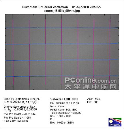 佳能EF-S 18-55mm f/3.5-5.6 IS镜头在55mm端产生0.242%的枕形畸变