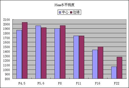 佳能EF-S 18-55mm f/3.5-5.6 IS在35mm上的表现总体上比18mm上了一个层次,各档光圈的表现都要比18mm时要好,在F5.6时中心分辨率达到1963LW/PH。不过在35mm时边缘分辨率比中心分辨率高的情况再次发生,在最大光圈F4.5时边缘分辨率甚至突破了2000LW/PH,达到2036LW/PH。在F8往后,边缘分辨率也比中心分辨率高。总体来看,在35mm时光圈在F8以下都保持了稳定的分辨率,各档光圈表现平均。