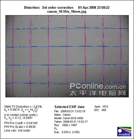 佳能EF-S 18-55mm f/3.5-5.6 IS在18mm端产生-3.63%的桶形畸变