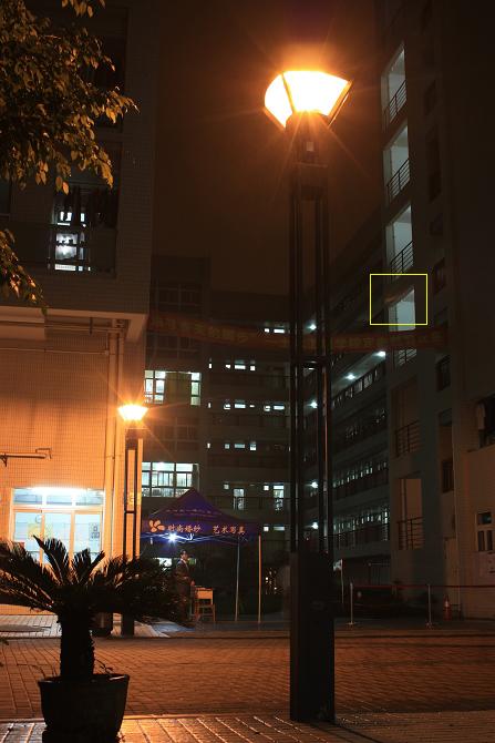 对于样张场景的灯光如此靠近的情况下,我们都几乎难以发现耀斑,只在黄框内出现了轻微的耀斑,表现令人惊喜。不过在靠近画面的灯光的上方出现了发散不均匀的光晕。