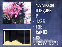 选定某一张照片,这时候屏幕会弹出照片详细的拍摄参数,包括直方图,可以让拍摄者直观、快速的判断曝光是否正常。D-Lighting功能目前已经全面应用到尼康旗下的所有型号数码相机中,包括数码单反相机,这项强悍的功能可以在细节损失最小的情况下,非常方便地修正画面亮度,提高逆光或阴影下成像的宽容度。可能这一功能对于熟悉后期制作的摄影爱好者来说,有些多余,但对于普通家庭用户来说,不过操作简单,而且效果明显。