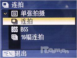 BSS是一个自动化获得最佳影像的工具,当选择BSS开启后,只要按住快门,相机就会在一直拍摄,当松开快门后,相机将会从所拍摄的所有照片中选择一张最为清晰的照片保存。16幅连拍功能比较有意思,它能够以最高连拍速度拍摄16张照片,并且这些照片将被合并为一张进行存储。