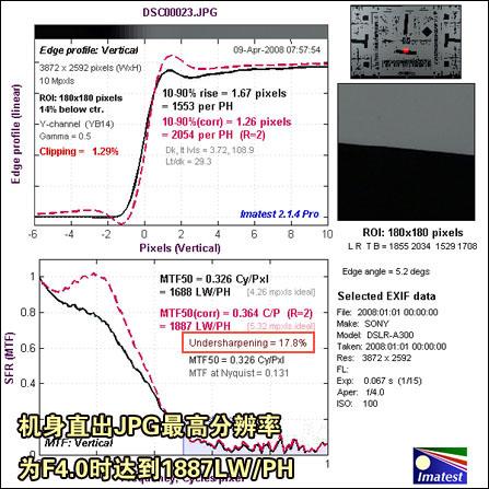 值得注意的是,在默认状态下索尼α300的机内直出JPG锐度较为保守,通过分辨率测试示意图可以看出,红框部分为Undersharpening=17.8%,表示实际锐度要低于理论值锐度17.8%,并且理论值分辨率在锐度设定的不同情况下也会发生变动,所以通过适当的锐化索尼α300的分辨率实际值会较1887LW/PH优秀不少。针对蔡司镜头在50mm的成像是否为最佳分辨率焦段,详参后续镜头评测。