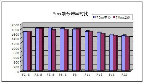 当焦段达到70mm时,镜头的最优可利用光圈段提前了,在F3.5-5.6下锐度较佳。最高分辨率出现在F4.5时达到1839LW/PH。同样是最大光圈F2.8下收缩半档后成像得到了不少的提升,小光圈方面也整体维持在1600LW/PH附近。值得注意的是在70mm端F18或F22等小光圈下容易出现轻微色散情况。