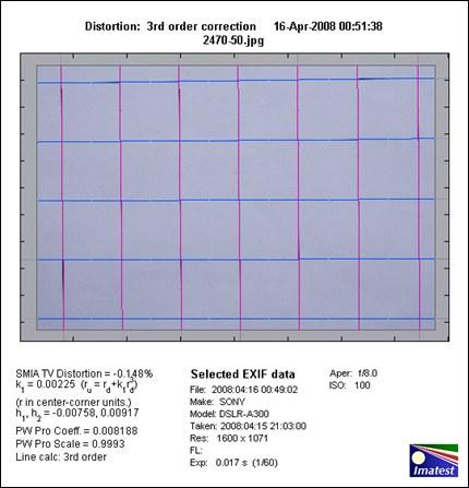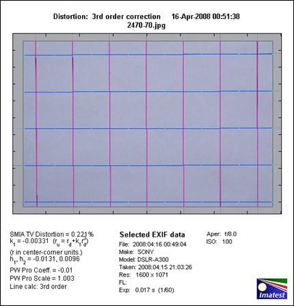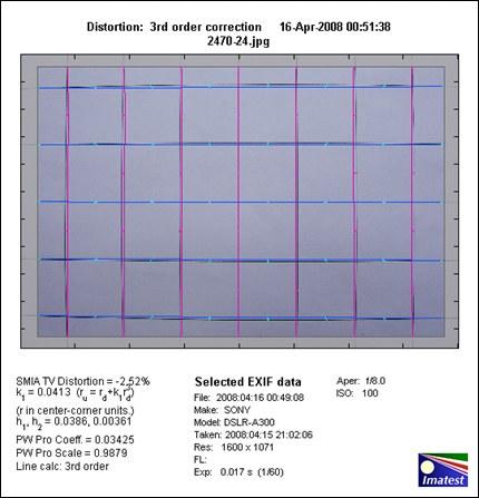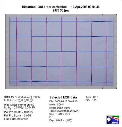 本测试项目着重表现镜头所产生的图像变型,相机拍摄Imatast软件指定的正方形方格图,然后用Imatast软件进行镜头畸变的量化测试。测试结果以百分数标示,数值越接近零,表示畸变越小。数值为负的,表示为桶形畸变,画面向外膨胀。数值为正的,表示为枕形畸变,画面向内收缩。