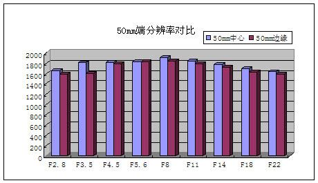 50mm端时,最大光圈F2.8下锐度并不及24mm好,但稍为收缩到F3.5便可以看出明显的进步,此时分辨率为1822LW/PH。当光圈去到F8的时候,达到最大分辨率1927LW/PH。整体来说表现还是十分平稳。