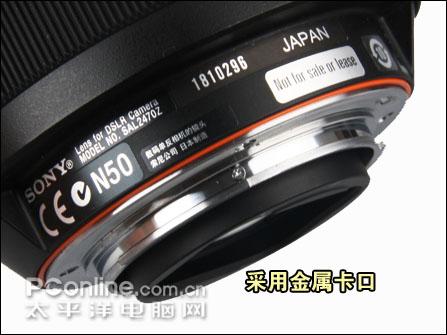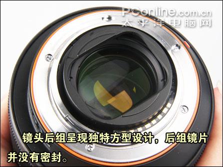 除变焦环和对焦环之外,整支镜头都为金属铸造,为抗耐磨提供了优越的条件。镜头卡口为银色设计,底部一层橙色的圆环为α系统的标志。在黑色的镜筒中附上橙色的圆环为镜头增加不少灵气。