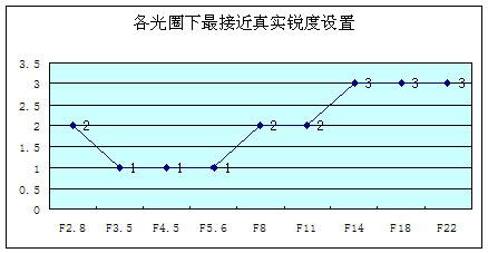 通过在机身设置4级的锐度对比,可以看到分辨率是得到了提升。但是这个过程里面并不是最高分辨率就是代表最真实的镜头解像能力。为了更好地表现镜头的真实解像力,我们通过对Undersharpening和Oversharpening的数值变化来衡量画面的真实分辨率。原则上选择Undersharpenin值最接近0的值,舍弃产生Oversharpening的值,不过当Undersharpening远远高于Oversharpening时(例如Undersharpening大于7%,Oversharpening小于1%)则选取Oversharpening的值。以下是各光圈下最接近真实锐度设置的对比: