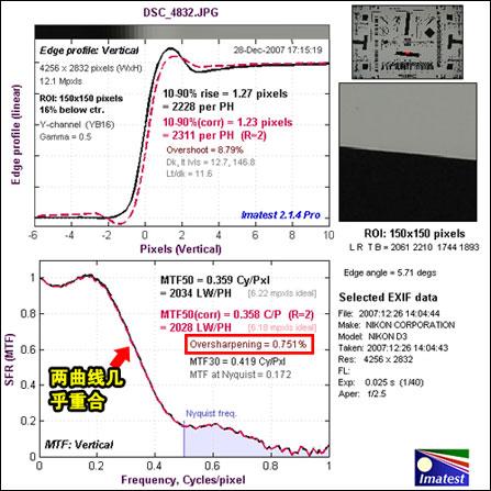 关于Undersharpening和Oversharpening的解释:我们知道在Imatest的测试下,若对数码相机的JPEG进行锐化设定,在图表中会被软件察觉,并告诉你锐化的程度(oversharpening)。同样,若对JPEG采取较保守的锐化,软件也会告诉你不锐化的程度(undersharpening)。这样的做法是可以避免各厂家的数码相机利用不同的锐利化程度来“美化”分辨率的数字,让大家在基准点进行比较。