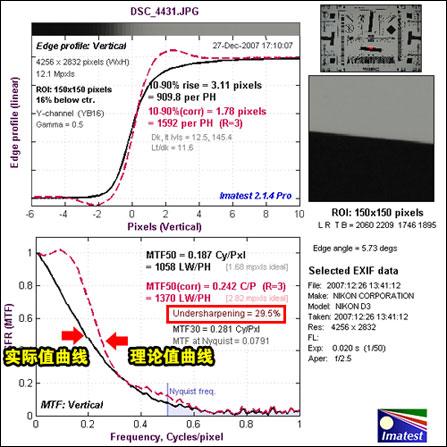上图中,红色方框位置显示“Undersharpening=29.5%”,表示机身输出的JPG文件还不够锐化。图中黑色的实际值曲线与红色理论值曲线有比较大的差距,两曲线并没有重合。在红色方框上面的红色数值“1370 LW/PH”表示理论值的锐度;再上面的黑色数值“1058 LW/PH”表示实际值的锐度。上图为机身锐利化设定为“0”(0-9共10级),Undersharpening达到29.5%,表示实际值与理论值相差29.5%。