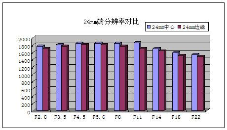 可以看出,Vario-Sonnar T* 24-70mm F2.8 ZA SSM的分辨率表现是让人满意的,在24mm端从F2.8开始便有着不错的锐度,达到1778LW/PH。锐度一直到F11不断小有上升,到F11时达到最大值为1875LW/PH。从F14开始锐度有所下降但整体水平还是不错。边缘锐度与中心锐度维持着一定的关联,并且整体表现平稳。由于该镜头专为全幅开发,所以边缘分辨率并不等同于该镜头实际的边缘分辨率,而是在APS-C数码单反上折算后的边缘分辨率,权作参考。