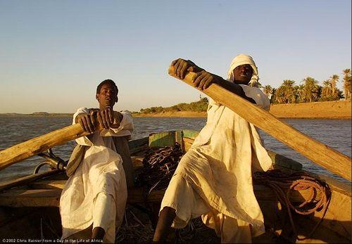 Sudan Meroe ruins。在努比亚沙漠中靠近麦罗埃(Meroe)古老皇家金字塔的地方,苏丹渡船将农场工人运过尼罗河。
