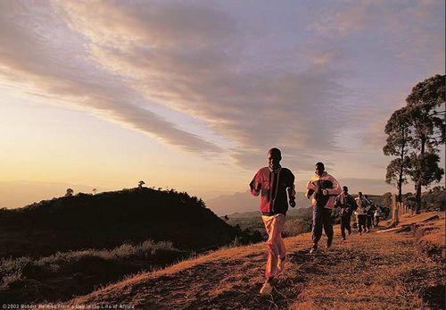 Kenya Eldoret。在近邻肯尼亚埃尔多雷特(Eldoret)的地方,人们沿着非洲大裂谷的边缘训练长跑。许多肯尼亚具传奇色彩的长跑运动员在孩童使其都在稀薄的高原空气中奔跑数英里去上学,从而培养了他们超群的耐力。