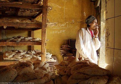 在邻近大金字塔的Mena镇,面包师在层层堆叠的aish(阿拉伯语aish既表示“人性”,又有“面包”的意思)的围绕之中吸烟小憩。作为世界上最古老的面包形式之一,aish在埃及的烘焙历史超过1500年。