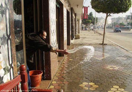 Egypt Cairo。埃及Mena镇的一个店主向人行道上撒水,以减少沙漠尘土。