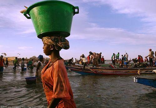 在冈比亚的坛吉(Tanji),黎明时分村庄的渔船汇集之后,一名妇女涉水来到海滩,头顶的巨大木桶里装满了刚刚捕捉的鱼。坛吉的妇女将装满载的木桶——最多颗装载100磅——运回海岸,在那里每桶鱼可以出售大约五美元。