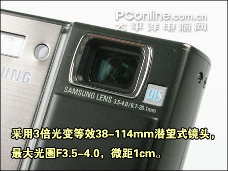 三星蓝调i100采用三星自家镜头,没有在潜望式数码相机中配备高素质的施耐德镜头不得不说是有点遗憾。很显眼可以看到镜头旁边有OIS光学防抖标志,另外镜头为3倍光学变焦,涵盖38-114mm焦段,最大光圈F3.5-4.0,在现在众多的镜头类型当中还算是比较过时的参数,不过能实现1cm超级微距还是十分有用。快门速度为,自动: 1~1/1,500 秒,夜景: 16~1/1,500 秒。夜景模式下能实现光圈和快门参数的手动调整。