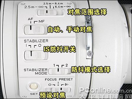 佳能300/2.8的设置按钮有很多,各个代表功能如图所示。其中需要留意的是对焦范围选择和预设对焦两项。另外IS光学防抖的效果也相当强悍,实际试用时竟然可以达到1/40秒的快门速度拍摄而画面不模糊(1/30秒都可能,只是成功率低一点)。
