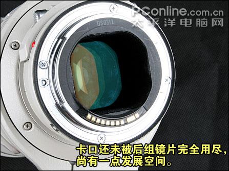 观看镜头后组,卡口的空间还未被后组镜片完全用尽(著名的佳能 EF 85mm f/1.2L II USM,上面卡口的黑色部分也被镜片占据,没有多余的空间了)。