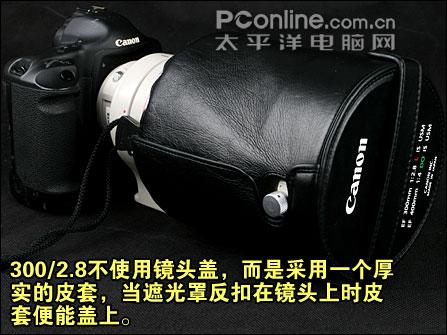 镜头前组直径大,不但不能安装前置滤镜,连镜头盖都不能使用传统的样式。当反扣遮光罩后,配套的皮套便能稳当的包裹镜头。该皮套同时适合佳能EF 400mm f/4 DO IS USM镜头使用。