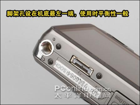 脚架孔设在机底最一端,当使用三角架拍摄的时候,机身就不能架在云台的中间,感觉怪怪的,而且有点不太方便。还好的是,脚架孔使用金属材质。另外,机底只有有一个数据接口,但并没有外壳保护。使用的是索尼自家的多用途端子的USB接口,这并不人性化,并不兼容一般USB接口,当没有带数据线或记忆棒读卡器的时候,相信拥有一般USB连接线的朋友还是不少。