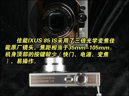 佳能IXUS 85 IS采用了原厂佳能镜头,可3倍变焦,焦距相当于35mm-105mm,可应付一般日常拍摄。虽然该机镜头微距为3cm,但其表现能力也相对令人满意,色彩还原还是较为逼真。机身上方按键较少,容易上手,电源键处的凹陷凸显人性化,有效避免在拍摄操作过程中造成关机现象。变焦的转盘使用过程中也很是流畅,无阻滞现象。