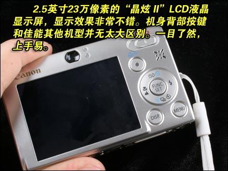 佳能IXUS 85 IS的配备了2.5英寸的LCD,和现市场流行趋势的3.0,3.5大英寸LCD相比处于劣势,但其现像效果优越,色彩分明,为佳能力推的“晶炫II”LCD。机身背部也和其他佳能机型大致雷同,无明显差别,对于刚购买的用户十分便于操作。如要鸡蛋挑骨头的话,笔者觉得浏览键与拍摄模式需互相推拉切换,有些许不便,笔者还是偏向于带独立浏览按键的机型,各有所好,如是那样的话,也不是IXUS系列了。