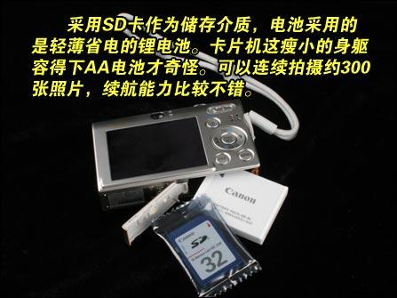 佳能IXUS 85 IS采用NB-6L锂离子充电电池供电,续航能力比较令人满意的,满电大概可拍摄300张左右照片。该机采用SD卡做存储介质,随机还附赠了32MB容量的SD卡,用来试机还是绰绰有余的。