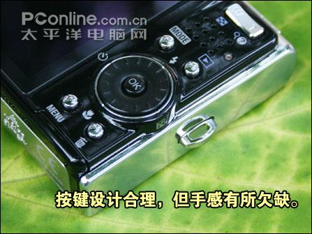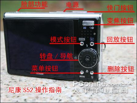尼康S52机背按钮设计合理,配有高端相机才采用的操作转盘,不过阻尼还是有所不足,很轻易就会误触。小型的按钮光滑并突起较高,操作起来定位准确,但是手感不是很好。