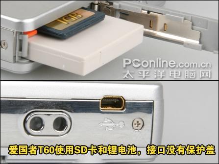 使用SD卡是数码相机趋势,这也降低了用户日后投资的成本。卡片机为了减少体积不使用锂电池而使用5号电池是没有道理的。爱国者T60的USB接口没有保护盖,平时就要多加小心了,以避免沙尘泥土的进入。