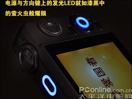 环绕着电源键和方向键是发光LED,在暗处亮着的LED犹如漆黑中的萤火虫般耀眼,同时蓝色的光显出淡淡的优雅。