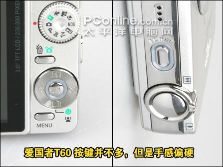 爱国者T60多少和佳能的IXUS90有几分相似。爱国者T60采用经亚光处理的金属外壳,外壳的手感不错,胜过很多日系的产品。机身尺寸为92.5mm x 58 mm x 19.9mm,重量 120g(不计电池)。这个体积并不算十分小巧。机身正面的上下两条弧线使得T60显得简洁大方。经过旋压处理的镜头环反光较大,使得机身正面会出现闪耀的效果。有趣的是T60的镜头不是位于镜头环的中央,而是上方。镜头左侧的“aigo”铭牌很精致,不过看上去似乎是贴上去的,令评测人员担心大量使用时会脱落。机身背面有个“大面子”。的确,人们都希望相机有个大LCD,因为现在这个追求极致的年代,大LCD才有大面子。不过因为这个“大面子”,使得LCD右面的按键显得较为局束。机身底部的脚架旋孔和顶部的变焦按钮造工较为一般,机身一侧的USB接口也没有防护盖,这些细节会令人感到有些不满。