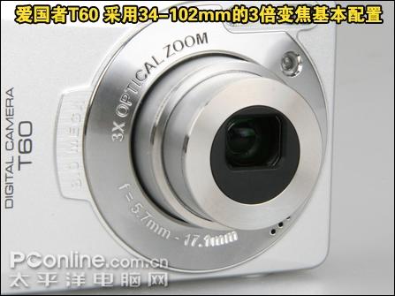 爱国者T60(资料 评价 图片 样张)是一款面向家庭用户的时尚数码相机,官方宣传该相机拥有“双核”。不过从参数上看,无论是1/2.5寸大小的800万像素CCD,还是3倍光学变焦,都几乎是现时的最低配置了,就算那块3寸23万像素的LCD也只能算是标准配置。更加令人遗憾的就是缺乏光学防抖了。不过还算可喜的是其价格只有1300元。