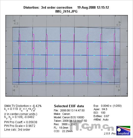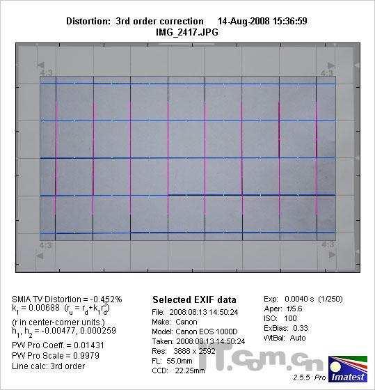 1000D的套机镜头焦距仍然是18-55mm,按佳能单反的焦距转换倍率1.6X,镜头焦距约相当于传统135相机的28-88mm。经测试得镜头广角端成像畸变值为-6.42%,桶形畸变相当明显;而镜头长焦端的畸变值为-0.452%,畸变轻微。看来这枚套机镜头在广角端的成像畸变控制还有待进一步提高。