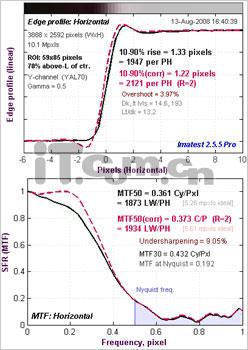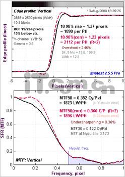 1000D套机所配的是EFS 18-55mm 1:3.5-5.6 IS防抖镜头,和原350D套机镜头相比多了IS,新镜头配合1000D的千万像素CMOS不知在成像质量上是否得到提升。我们选择了镜头的35mm焦距和F5.6光圈进行成像锐度测试,1000D成像中央锐度值为1896 LW/PH,边缘锐度值为1934 LW/PH。两者的锐度值在入门单反里都属于中偏高水平,而且成像中央和边缘的锐度相当,这点比较难得。